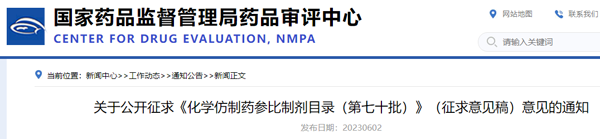 6月2日,国家药品监督管理局药品审评中心发文公开征求第七十批参比制剂目录的意见。