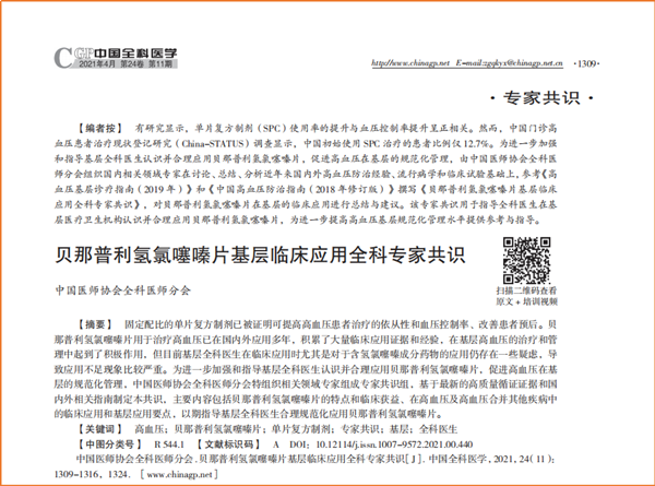 近日,中国医师协会全科医师分会组织编写的《贝那普利氢氯噻嗪片基层临床应用全科专家共识》在《中国全科医学》杂志上正式发表。