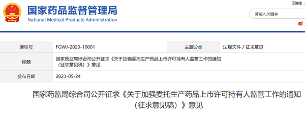5月24日,国家药监局发文公开征求《关于加强委托生产药品上市许可持有人监管工作的通知(征求意见稿)》意见。该通知对药品委托生产持有人的监管进行了严格规定。
