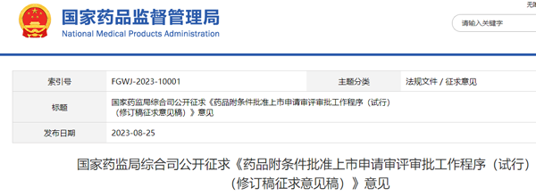 8月25日,国家药监局综合司发布《药品附条件批准上市申请审评审批工作程序(试行)(修订稿征求意见稿)》,公开征求社会意见。
