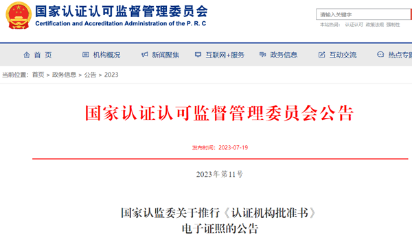 近日,国家认监委发布《关于推行《认证机构批准书》电子证照的公告》,自公告发布之日起,在全国范围内推行应用《认证机构批准书》电子证照,不再印发纸质《认证机构批准书》,进一步提升政务服务标准化、规范化、便利化水平。