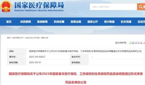 9月1日,国家医保局发布《关于公布2023年国家基本医疗保险、工伤保险和生育保险药品目录调整通过形式审查药品名单的公告》,正式公布2023年国家医保目录调整通过形式审查的申报药品名单,涉及目录外药品222个,目录内药品164个。