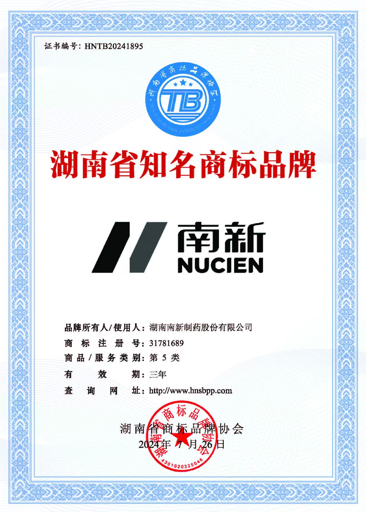 南新制药凭借卓越的产品质量和创新研发能力,荣获“湖南省知名商标品牌”,这不仅是对其品牌价值和市场影响力的充分肯定,也是对其在湖南省乃至全国医药领域所做杰出贡献的高度认可。