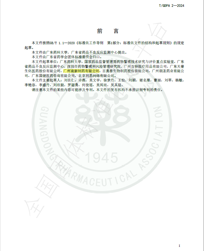 近日,广州南新制药有限公司参与了《药物警戒服务外包管理规范》(T/GDPA 2-2024)的起草与制定。该规范由广东省药学会发布,旨在为药品上市许可持有人提供在药物警戒服务外包活动中的指导,包括遴选受托方、签订协议、管理受托方、对受托方进行审计以及明确双方责任义务等方面的具体操作。