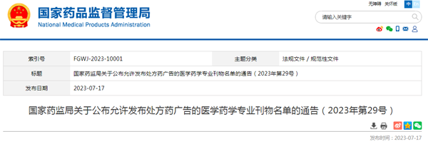 7月17日,国家药监局发布《关于公布允许发布处方药广告的医学药学专业刊物名单的通告》,新增《中国临床新医学》杂志。