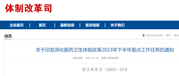 7月24日,国家卫生健康委等六部门联合印发了《深化医药卫生体制改革2023年下半年重点工作任务》,强调要促进优质医疗资源扩容和区域均衡布局、深化以公益性为导向的公立医院改革、促进多层次医疗保障有序衔接、推进医药领域改革和创新发展、健全公共卫生体系、发展壮大医疗卫生队伍。